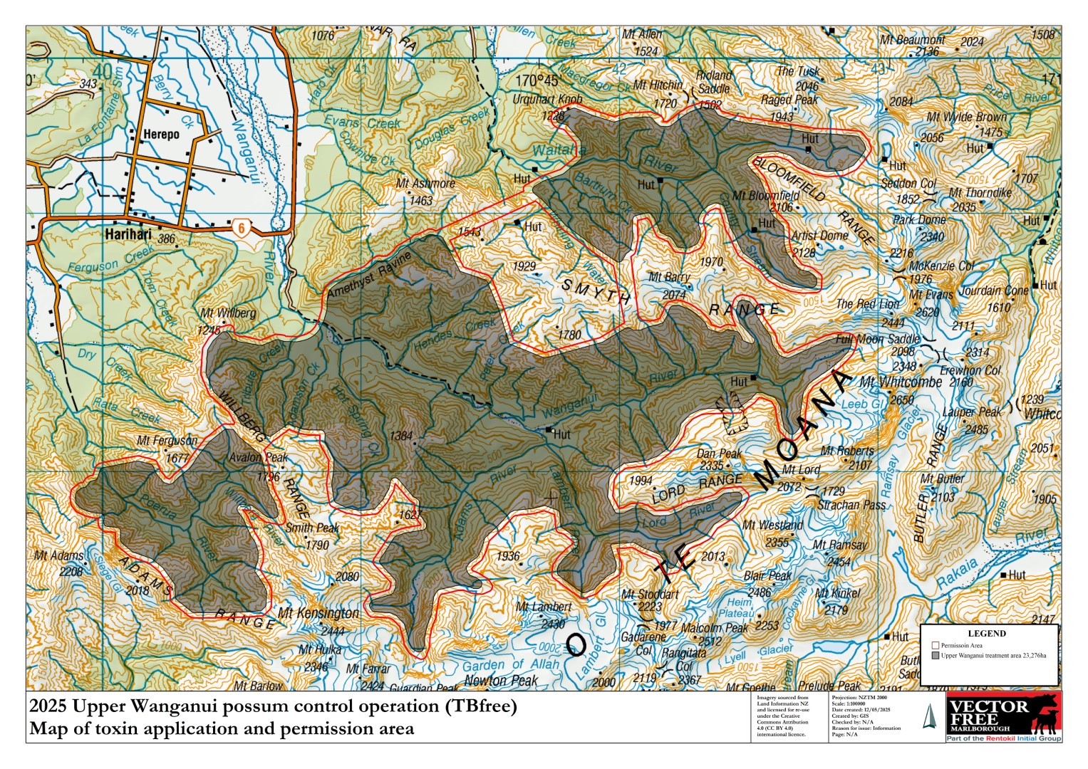 Status: Aerial application of bait containing the toxin sodium fluoroacetate (1080) was completed on 07 Nov 2025. People entering the area during the post operation caution period are advised to comply with all precautions stated on the toxin warning signage.